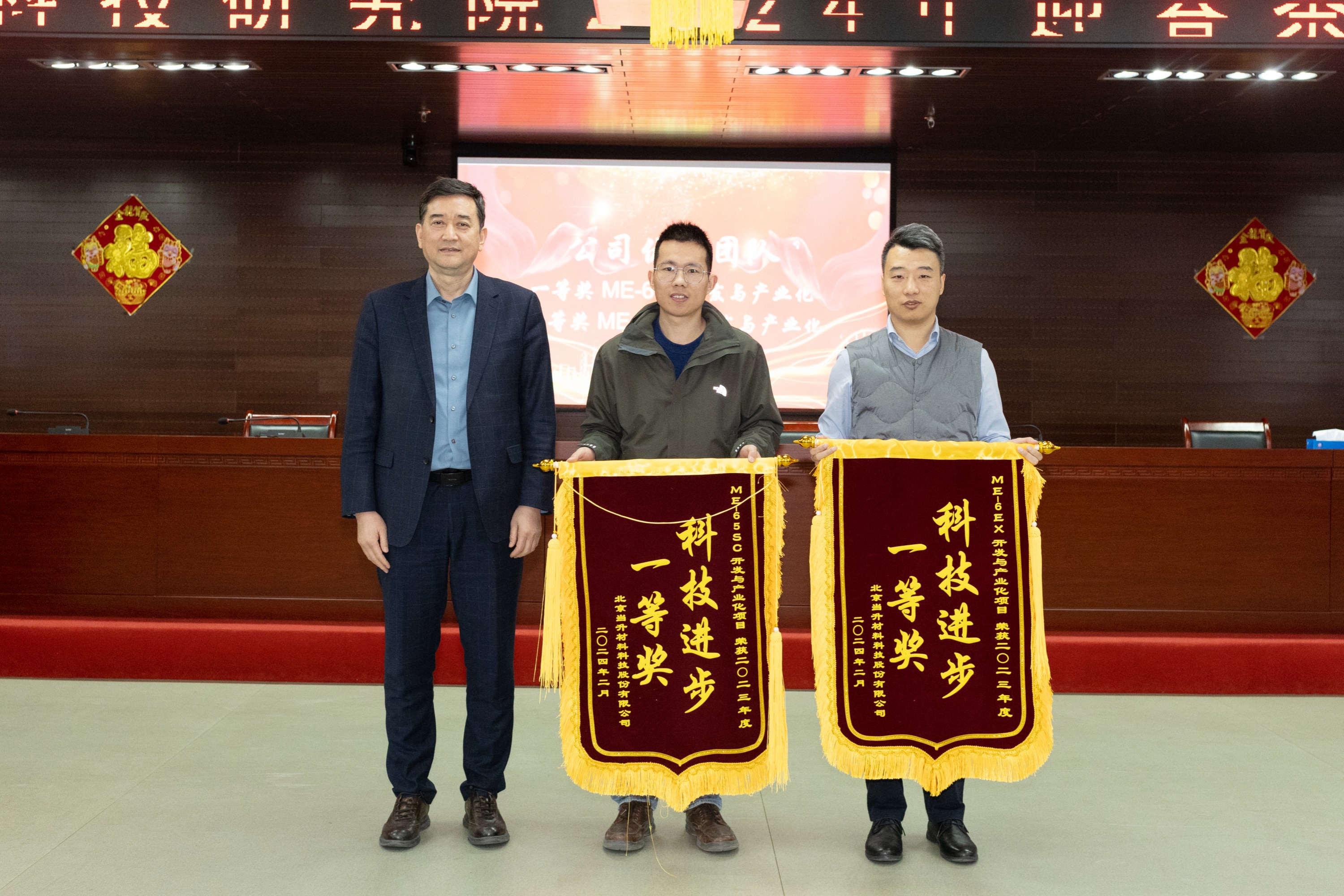 當升科技黨委書記、董事長、總經理陳彥彬為袁金沙(中)頒獎并合影留念